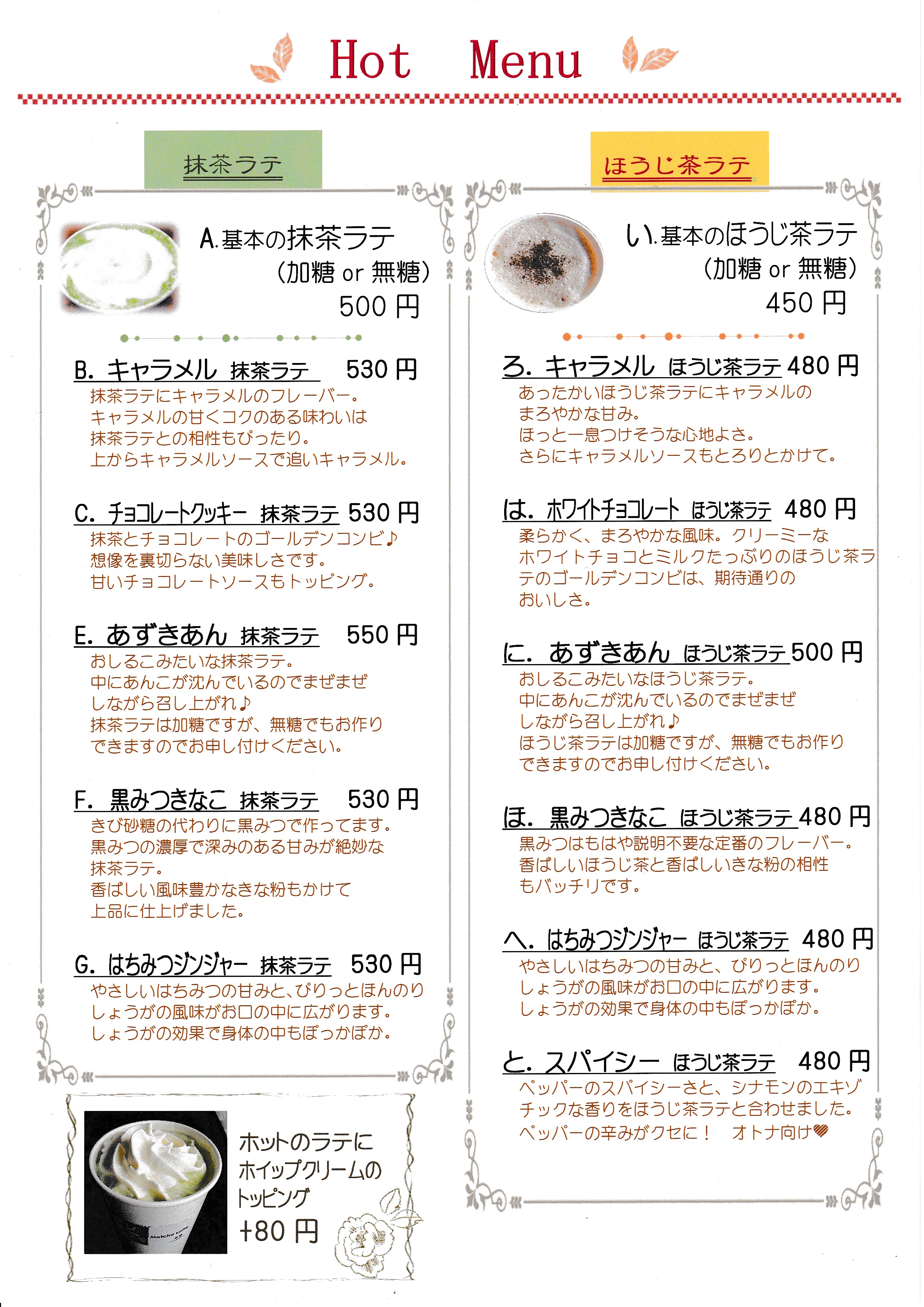 ↓HOTは、夏季は「基本の抹茶ラテ」「基本のほうじ茶ラテ」